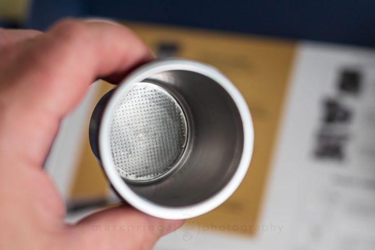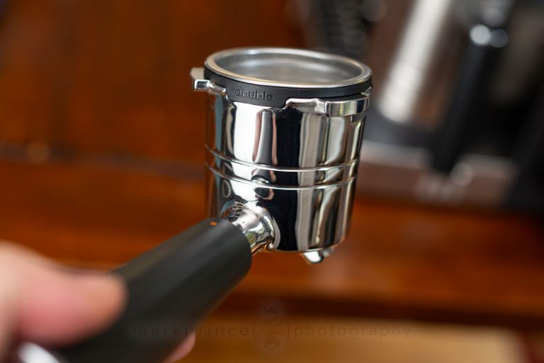 The tamper is a pillar design, and has a click effect with about 30lb of pressure applied. It is designed to work with the dosing collar, and using both ensures a very level pack on the ground coffee. Users have found that giving the portafilter a quick horizontal shake (our buddy Coffee Kev calls it the “Ninja Shake”) before removing the collar helps settle the fluffy mound of coffee and prevents spills.
