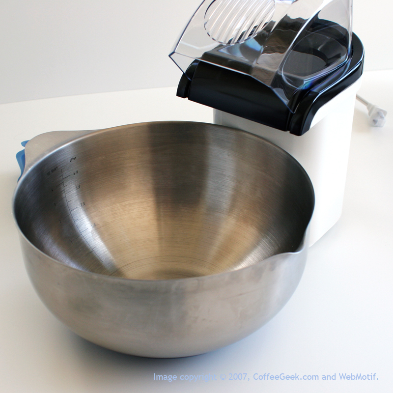 Large Bowl: really, any bowl will do; but it has to be big. You place the bowl in front of the popcorn popper’s air chute to collect all the chaff that will blow off your coffee as it is roasting.