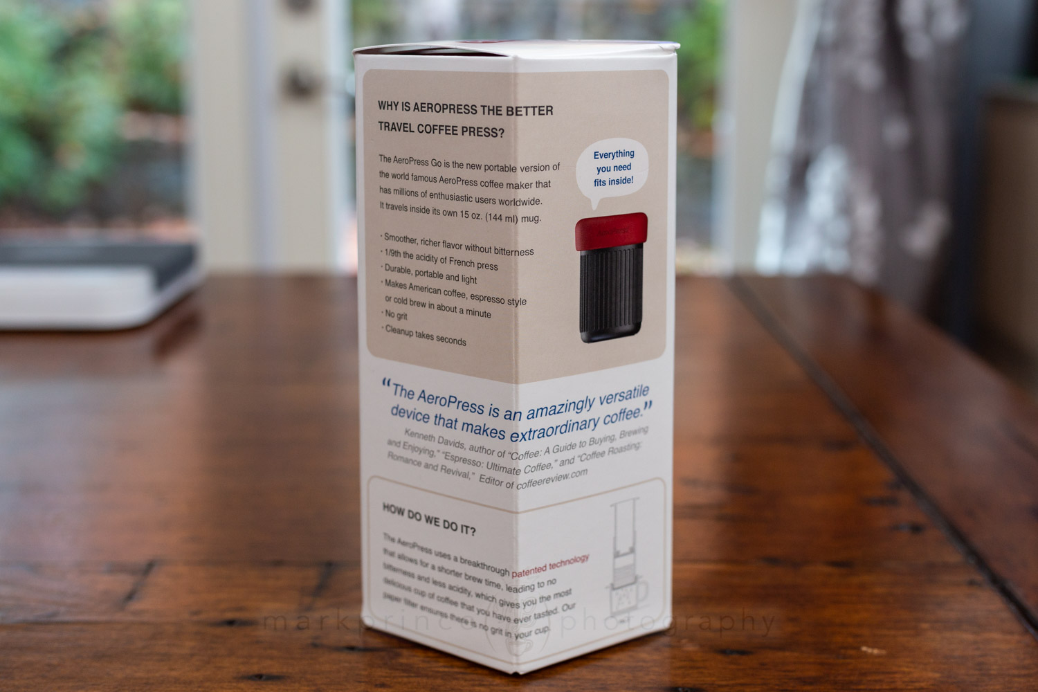 The Aeropress Go is boxed in a similar hexagonal style box that the original Aeropress is… but smaller. The outside of the box has lots of details about the product, and still says it makes espresso (we’ll leave that discussion out of this First Look) as well as coffee, and new for the Aeropress as a claim, “Cold Brew”.