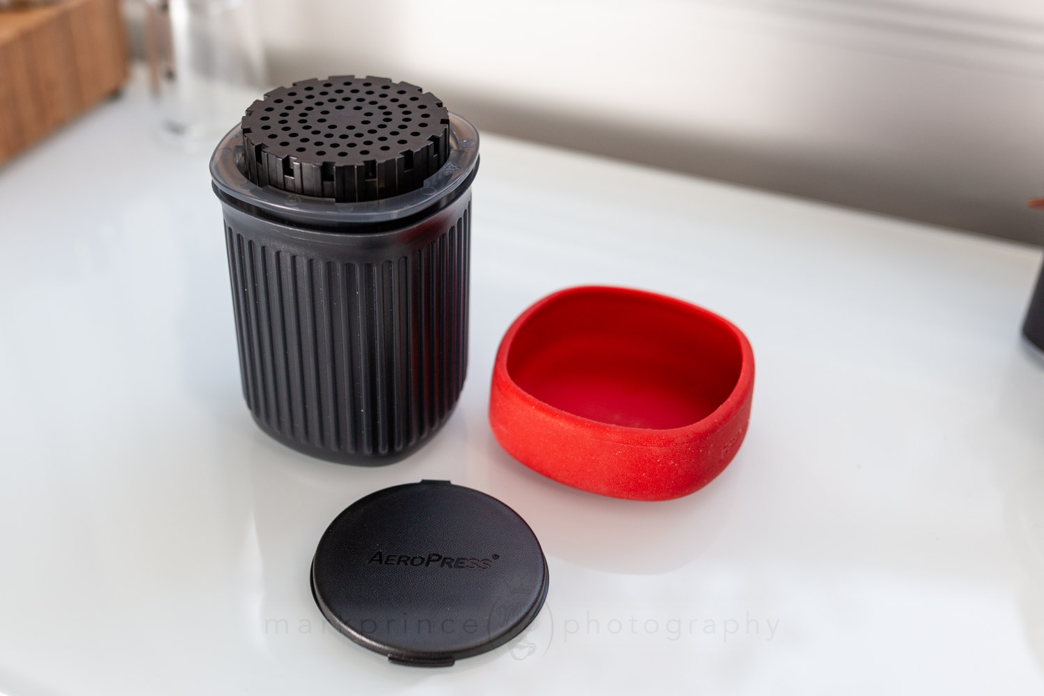 The fit of everything is quite good. The silicone red cover isn’t very tight, but it isn’t very loose either – it’s designed to easily slip on and stay in place while travelling. It also serves as base for the mug when you’re pressing down on the Aeropress. I also noticed the little plastic filter holder slots nicely on top of the Aeropress Go’s black filter assembly part when storing it for travel.